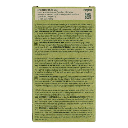 In lavastoviglie rimuove in modo affidabile calcare e depositi di grasso dall'interno, dai bracci irroratori e dall'inserto del filtro, per una pulizia igienica e una cura ottimale della macchina. Inoltre, pulisce a fondo la lavatrice rimuovendo in modo affidabile calcare, sporco, depositi e odori, soprattutto nelle zone difficili da raggiungere. L'uso regolare garantisce un lavaggio e un risciacquo a risparmio energetico, prolungando così le prestazioni ottimali di lavastoviglie e lavatrice. Si prega di seguire le istruzioni per l'uso del produttore dell'apparecchio. Confezionato in cartone riciclato a basso impatto ambientale, composto al 30% da carta d'erba. Questo consente di risparmiare acqua, energia e CO2.