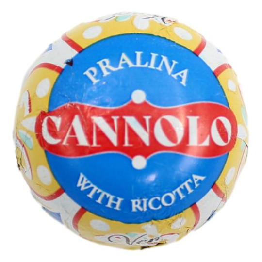 Venchi Pralina Cannolo, cioccolatino ripieno di cremosa ricotta con ciliegie e arance candite e una croccante granella di biscotto, ricoperto da un guscio di cioccolato fondente. Sacchetto da 100 gr.