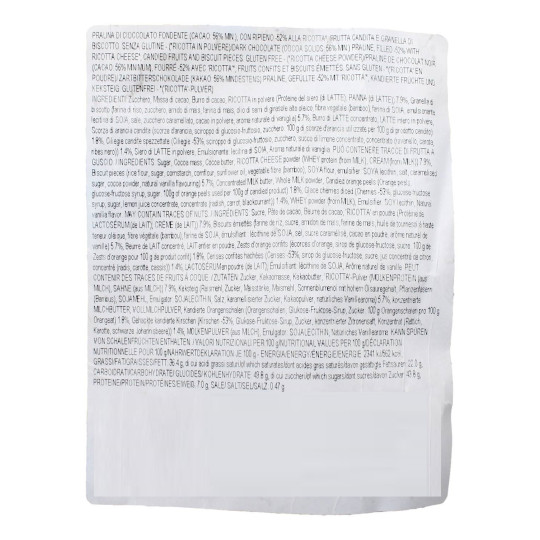Ingredienti: RALINA DI CIOCCOLATO FONDENTE (CACAO: 56% MIN.), CON RIPIENO -52% ALLA RICOTTA*, FRUTTA CANDITA E GRANELLA DI BISCOTTO. SENZA GLUTINE - (*RICOTTA IN POLVERE) INGREDIENTI: Zucchero, Massa di cacao, Burro di cacao, RICOTTA in polvere (Proteine del siero (di LATTE), PANNA (di LATTE)) 7.9%, Granella di biscotto (farina di riso, zucchero, amido di mais, farina di mais, olio di semi di girasole alto oleico, fibra vegetale (bamboo), farina di SOIA, emulsionante: lecitina di SOIA, sale, zucchero caramellato, cacao in polvere, aroma naturale di vaniglia) 5.7%, Burro di LATTE concentrato, LATTE intero in polvere, Scorza di arancia candita (scorze d'arancia, sciroppo di glucosio-fruttosio, zucchero. 100 g di scorze d'arancia utilizzate per 100 g di prodotto candito) 1.8%, Ciliegie candite spezzettate (Ciliegie -53%, sciroppo di glucosio-fruttosio, zucchero, succo di limone concentrato, concentrato (ravanello, carota, ribes nero)) 1.4%, Siero di LATTE in polvere, Emulsionante: lecitina di SOIA, Aroma naturale di vaniglia. PUÒ CONTENERE TRACCE DI FRUTTA A GUSCIO.