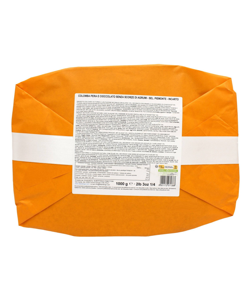 Albertengo colomba pere e cioccolato Selezione Piemonte, ricca di morbidi pezzi di pera e gocce di cioccolato, ricoperta di glassa e decorata con nocciole del Piemonte IGP intere, senza scorze di agrumi. Colomba Selezione Piemonte da 1 Kg.