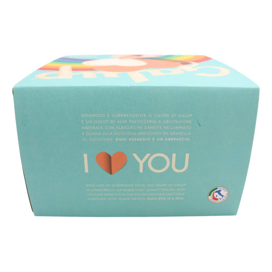 Galup colomba a forma di cuore con albicocche candite nell’impasto e glassa alla Nocciola Italiana Tonda Gentile Trilobata arricchita da granella di zucchero. Galup dedica questo dolce a tutte le mamme, infatti è nato proprio in occasione della festa della mamma e oggi lo troviamo disponibile tutto l’anno.