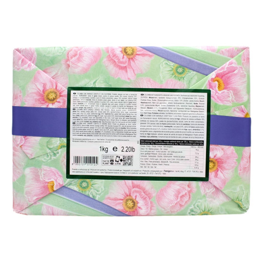 Flamigni colomba con scorze di arancia candita e uvetta sultanina, prodotta con solo lievito madre. Colomba pasquale straordinariamente soffice, con un impasto preparato con farina di grani forti ed elastici, zucchero, tuorli d’uova provenienti da allevamenti italiani a terra e burro francese di centrifuga. A completare la ricetta ci sono profumatissimi canditi d’arance Navel, uvetta sultanina di primissima qualità e l’aroma naturale di vaniglia. Copertura di glassa di nocciole tonde gentili delle Langhe, mandorle armelline pelate, albume d’uova di primissima qualità e finissima granella di zucchero. Colomba di Pasqua da 1 Kg incartata a mano.