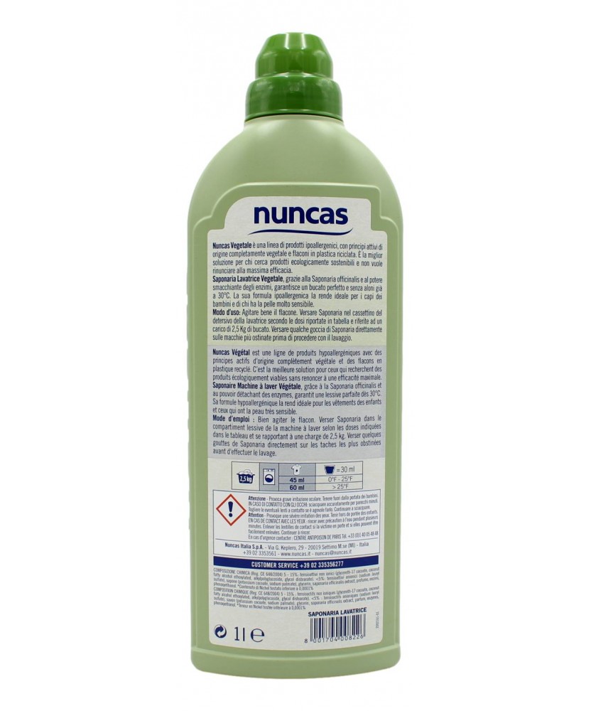 Nuncas Saponaria lavatrice è un detersivo ecologico liquido per lavatrice, attento alla salute della pelle. Come tutti i prodotti Nuncas Vegetale è dermatologicamente testato e ipoallergenico, non contiene sostanze allergizzanti di alcuna natura, conservanti o profumi, e il nichel presente nel prodotto è inferiore allo 0,00001%, la soglia sotto la quale anche un soggetto sensibile non manifesta una reazione allergica. Una caratteristica particolarmente importante, anche se poco tangibile, è la completa risciacquabilità: al termine del ciclo di lavaggio il detersivo liquido viene rimosso in modo completo, per non irrigidire le fibre ma soprattutto per evitare il contatto con sostanze chimiche. Indispensabile per lavare tutto il corredo dei neonati rispettando la loro pelle sensibile e delicata.