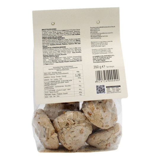 Ingredienti: Farina di grano tenero“0”, Zucchero, Scorze di arancio candite (Frutta, Sciroppo di glucosio-fruttosio, Saccarosio, Acidificante: acido citrico), Noci, Miscela di spezie, Anici, Miele, Agente lievitante (Carbonato acido d’ ammonio). Può contenere tracce di soia, mandorle, pistacchi, nocciole, latte, uova. Allergeni scritti in grassetto.