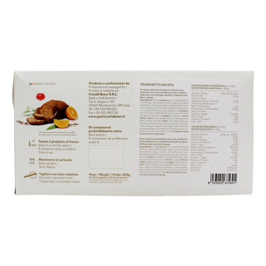 Bonci Bria Tronchetto al mojito, con scorza di limone e lime candita, accompagnata dal gusto di Rum e menta. Il sapore del cocktail Cubano più bevuto al mondo. Dolce nel formato da 500 gr. L’anima liquorosa del Panbriacone all'interno di un dolce dal formato innovativo tutto naturale e senza conservanti aggiunti, ottimo con il gelato, con le creme e perfino con la frutta fresca!