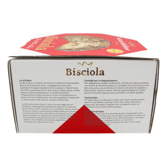 Bisciola, dolce tipico della valtellina prodotto da Dolciaria Valtellinese. Formato da 400 gr. Fonte di fibre, preparato con materie prime selezionate, con solo lievito madre naturale, senza conservanti.