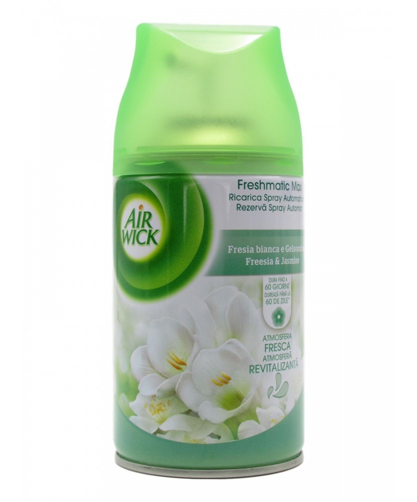 Ricarica per Air Wick spray automatico, profumazione alla fresa bianca e gelsomino. Diffonde fino a 60 giorni di fragranza nel tuo ambiente. Una fragranza fresca che unisce le proprietà della fresia e del gelsomino francese ai fiori bianchi.