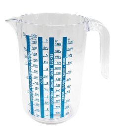 Caraffa graduata da 1,5 litri di capienza. Pratica e comoda caraffa per la misurazione di liquidi, zucchero, farina, e tanti altri alimenti. Prodotto Made in Italy.