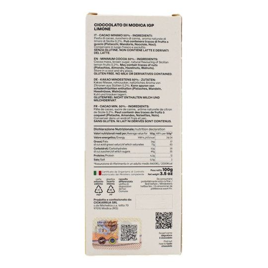 Ingredienti: Cacao minimo 50%. Pasta amara di cacao, zucchero di canna, aroma naturale limone 0,2%. Può contenere tracce di frutta secca a guscio (mandorle, nocciole, noci, pistacchi).