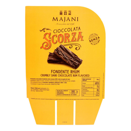 Finissimo cioccolato Scorza fondente extra (cacao 60% min) con rhum. Confezione da 100 gr. Prodotto senza glutine. Majani, cioccolato d’eccellenza a Bologna dal 1796.