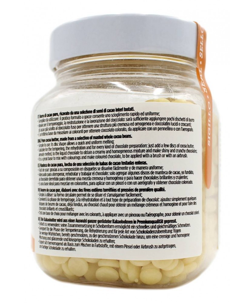 Burro di cacao in bottoni dal colore e sapore neutro. 100% burro di cacao, 100% vegetale. Burro di cacao puro, ricavato da una selezione di semi di cacao interi tostati. Semplice da utilizzare, il pratico formato a gocce consente uno scioglimento rapido ed uniforme. Ideale per il temperaggio, la reidratazione e la lavorazione del cioccolato: sarà sufficiente aggiungere pochi dischetti di burro di cacao, già sciolto, al cioccolato fuso per ottenere una struttura più cremosa ed omogenea. È un’ottima base da miscelare ai coloranti per ottenere cioccolato colorato, da applicare con un pennellino.