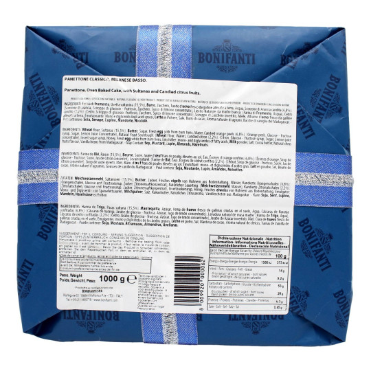 Bonifanti Panettone Gran Milanese Basso, un chilo di bontà! Il panettone di Bonifanti nella sua ricetta originale con uvetta sultanina e scorze candite d’arancia e di cedro, qui nella sua versione bassa che concentra ed esalta i sapori e i profumi dell’impasto. Prodotto da forno a lenta lievitazione naturale. Bonifanti dal 1932 produce panettoni e colombe con solo lievito da Madre Bianca Bonifanti.