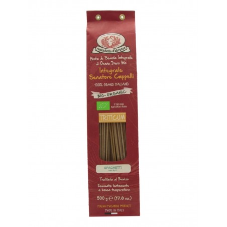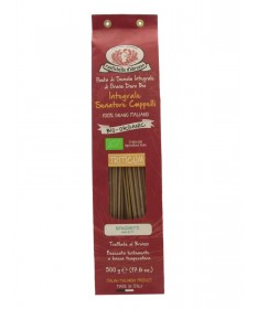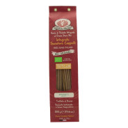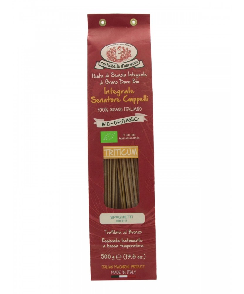 Spaghetti Integrali Bio prodotti da Rustichella d'Abruzzo, una pasta di semola di grano duro Bio Integrale, 100% grano italiano. Trafilata al bronzo ed essiccata lentamente a bassa temperatura, hanno un'inconfondibile rusticità e sono naturalmente ricchi di fibre. Questi spaghetti sono perfetti per accogliere i condimenti più elaborati come quelli di pesce, gustosissimi saltati in padella con un mix di verdure di stagione per gli amanti della cucina leggera e ottimi per un pranzo veloce in abbinamento ad un sugo all'arrabbiata biologico. Tempo di cottura: 9-11 min.