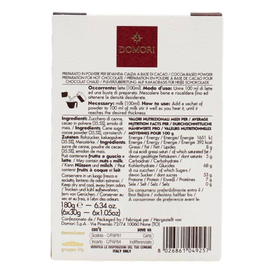 Domori Preparato per cioccolata calda, prodotto gluten free. Confezione con 6 bustine da 30 gr ciascuna.