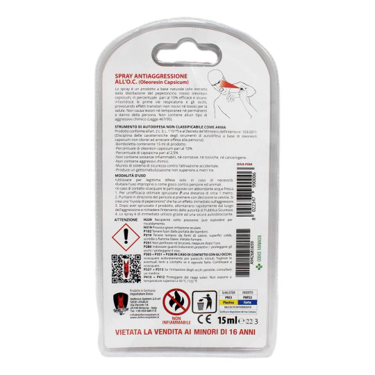 Diva Spray antiaggressione all'O.C. (Oleoresin Capsicum), strumento di autodifesa non classificabile come arma. Compatto e discreto, si può riporre comodamente in tasca o in borsa. Progettato per offrire una protezione efficace in situazioni di pericolo. Il dispenser è dotato di un meccanismo di sicurezza per prevenire attivazioni accidentali. Versione Pink, formato da 15 ml. Prodotto non vendibile ai minori di 16 anni.
