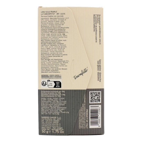 Fetta di torrone friabile con nocciole del Piemonte IGP. La Torronfetta è un esclusiva produzione di Barbero, una fetta di torrone sottilissima e singola da poter gustare in un momento di relax. Il Torrone friabile di Barbero è lavorato ancora con l’antica ricetta del torrone d’Asti con lunga cottura in caldaie a vapore e l’impiego di materie prime di alta qualità.