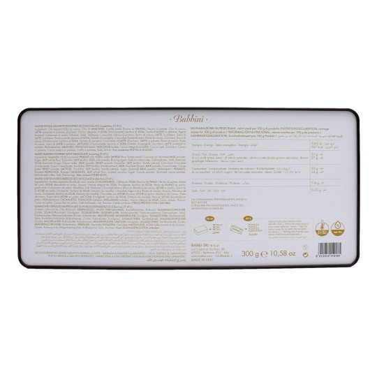 Babbi Piccoli Piaceri Babbini assortiti in confezione di latta. All’interno Babbini assortiti: Arachide, Caffè, Cocco, Fondente, Nocciola, Pistacchio. Scatola regalo da 300 gr. I Babbini, fragranti Wafer ricoperti da un finissimo strato di cioccolato, sono racchiusi nell originale latte Piccoli Piaceri: una golosissima idea regalo. Tanti gusti diversi per accontentare ogni palato: al Pistacchio ricoperto di cioccolato bianco, al Fondente e al Caffè ricoperti di cioccolato fondente, alla Nocciola, al Cocco e all'Arachide ricoperti di cioccolato al latte.