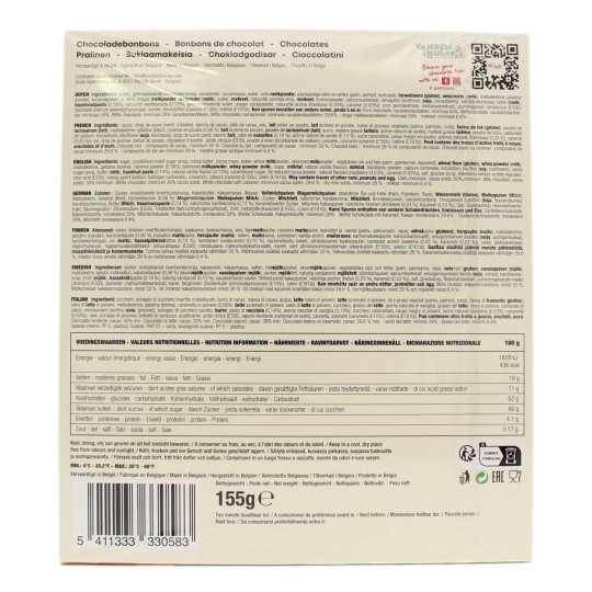 Pralina Petit Melo con due strati di cioccolato belga e un cuore di soffice schiuma di zucchero. Scatola regalo con mix di cioccolati, formato da 250 gr.