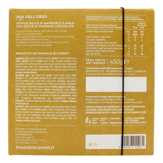 Di Masso, soffice dolce di mandorle e miele con gocce di finissimo cioccolato. Il Pan dell’Orso è un soffice dolce di Pan di Spagna a base di mandorle e miele, farina, burro di latteria, uova fresche. In questa versione non glassato, ma con all’interno gustosissime gocce di cioccolato puro. Pan dell’orso da 450 gr, prodotto artigianale da forno.