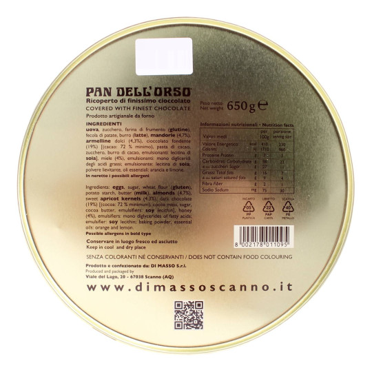 Di Masso, soffice dolce di mandorle e miele con gocce di finissimo cioccolato. Il Pan dell’Orso è un soffice dolce di Pan di Spagna a base di mandorle e miele, farina, burro di latteria, uova fresche. In questa versione glassato con un finissimo strato di cioccolato fondente. Pan dell’orso da 650 gr, prodotto artigianale da forno, in scatola regalo di latta.