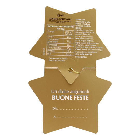 Scatola di Natale a forma di stella, elegante confezione arricchita da glitter. All’interno: Lindor al latte, fondente 60%, bianco.