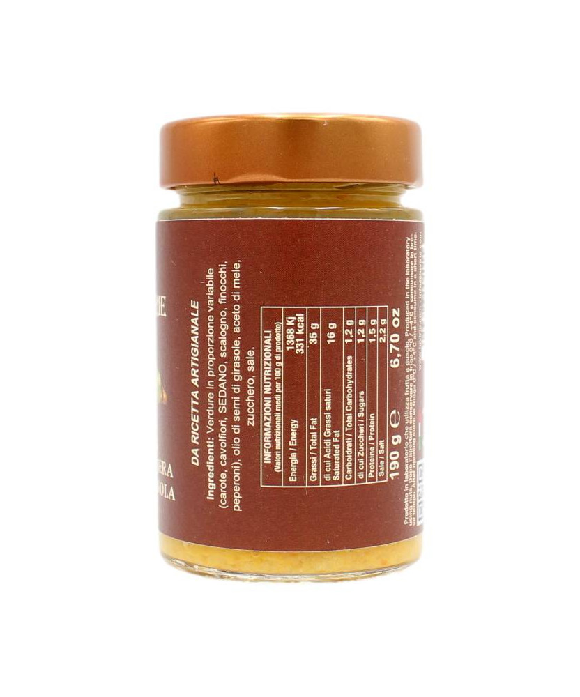 Ingredienti: verdure in proporzione variabile (carote, cavolfiori, sedano, scalogno, finocchi, peperoni), aceto di mele, zucchero, sale di Cervia. Prodotto senza glutine, alimento vegano. Scadenza 30 mesi c.a.