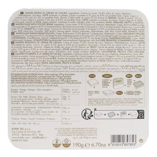 Babbi Waferini Oro al cacao, waferini ripieni di cacao, in elegante scatola di latta da 190 gr.