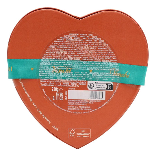 Ingredienti: CIOCCOLATINI ASSORTITI. SENZA GLUTINE INGREDIENTI: Zucchero, Massa di cacao, Burro di cacao, LATTE intero in polvere, Pasta di NOCCIOLA Piemonte IGP, Cacao in polvere, Massa di cacao origine Sud America, NOCCIOLA Piemonte IGP, Pasta di PISTACCHIO, Pasta di MANDORLE, Cioccolato fondente (massa di cacao, zucchero grezzo, burro di cacao. Cacao: 63.6% min.), crema alle NOCCIOLE e al cacao (Zucchero, Pasta di NOCCIOLA Piemonte IGP 21.0%, Olio di girasole, Cacao magro in polvere 12.0%, LATTE magro in polvere, Burro di cacao, Olio di oliva, Emulsionante: lecitina di SOIA, Aroma naturale di vaniglia), Sciroppo di glucosio, Burro di LATTE concentrato, NOCCIOLA Piemonte IGP caramellata (zucchero, NOCCIOLA Piemonte IGP 48%), Granella tostata di fave di cacao, zucchero grezzo, Pasta caffè (caffè 60%, burro di cacao), Fibra di radice di cicoria, Siero di LATTE in polvere, Caramello (zucchero, sciroppo di glucosio, PANNA (da LATTE), BURRO (da LATTE)), oli e grassi vegetali (olio di girasole, burro di cacao, olio di oliva), PISTACCHIO tostato, Emulsionante: lecitina di SOIA, PISTACCHI salati (PISTACCHI - 98,5%, sale), Scorza di arancia candita (scorze arancio, sciroppo di glucosio-fruttosio, zucchero, acidificante: acido citrico. 100 g di frutta utilizzata per 100 g di prodotto candito), Granella al gusto di menta (Zucchero, sciroppo di glucosio, BURRO (di LATTE), MANDORLA, LATTOSIO, lecitina di girasole, aroma naturale di menta), Acqua, LATTE intero condensato zuccherato - 9% materia grassa (LATTE, zucchero), Grasso di LATTE anidro, Olio di oliva, Aroma naturale di vaniglia, Te verde matcha in polvere, Aroma naturale, Sale, Agente di rivestimento: gomma arabica, Acidificante: acido citrico, Aroma naturale di limone, Vaniglia in bacche macinata. CONTIENE / PUÒ CONTENERE TRACCE DI: LATTE, SOIA, FRUTTA A GUSCIO