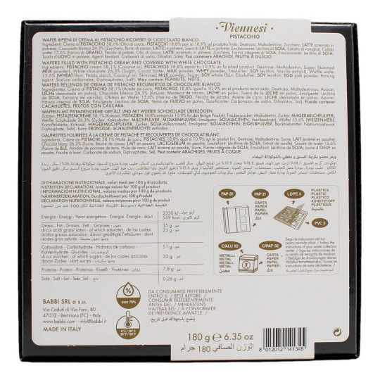 Il viennese al pistacchio di Babbi racchiuso nella preziosa confezione De Luxe, un cadeau unico ed elegante. Un wafer con copertura di cioccolato bianco e ripieno di crema al Pistacchio. Scatola regalo da 180 gr.