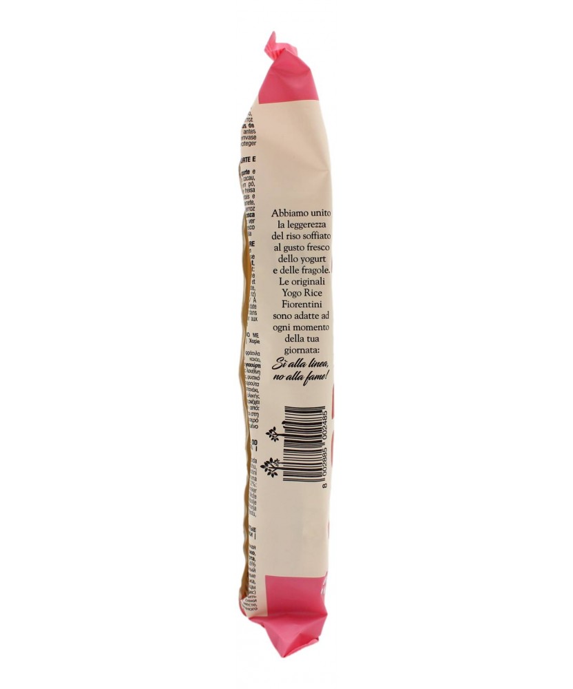 Fiorentini Yogo Rice gallette di riso ricoperte allo yogurt e fragola. Le classiche gallette di riso uniscono la croccantezza ad una dolcezza impagabile grazie alla copertura al gusto di yogurt e fragola. Senza conservanti né coloranti artificiali. Prodotto senza glutine. Può contenere frutta a guscio.