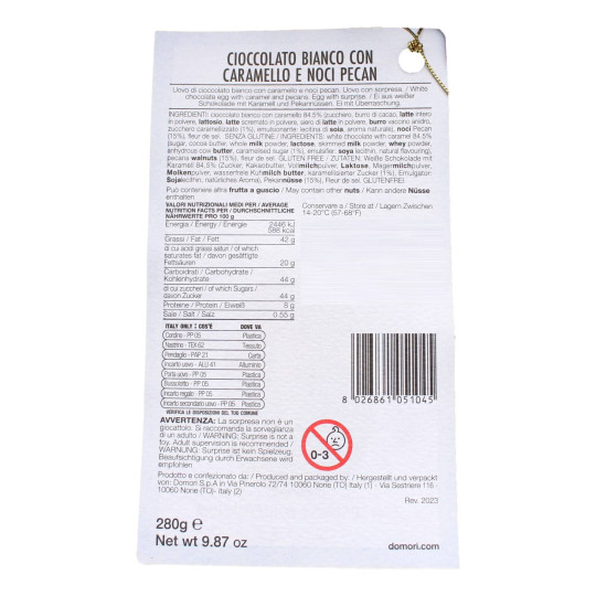 Domori uovo al cioccolato bianco con caramello e noci pecan. Uova di Pasqua da 280 gr, con sorpresa portafortuna.