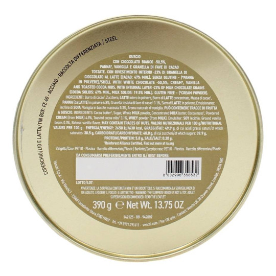 Uovo Venchi Chocoviar Stracciatella con microperle di cioccolato al latte. Lasciati avvolgere dal questo goloso uovo di cioccolato bianco con panna, nibs di cacao e bacche di vaniglia, rivestito internamente da granella Chocoviar latte. Confezionati in cilindro di latta, all’interno una sorpresa Chocoviar. Uova di Pasqua gourmet da 390 gr. Novità 2024, tutta la bontà del nostro iconico cioccolatino, in un formato perfetto da condividere.