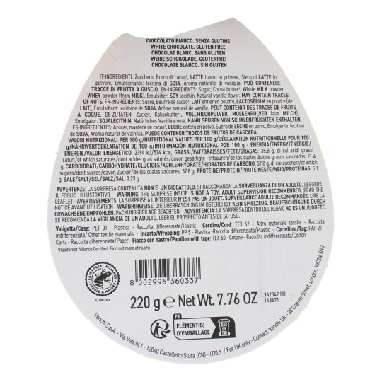 Venchi uovo al cioccolato bianco. Uovo di Pasqua da 220 gr.